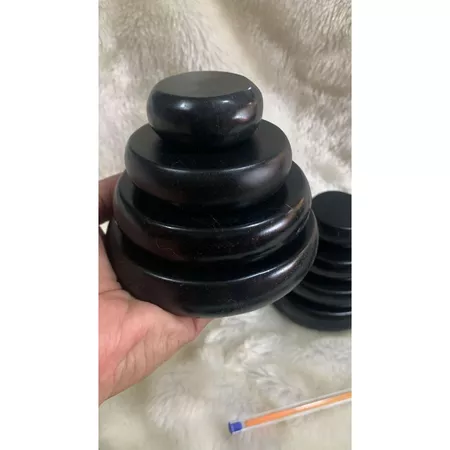 Kit com 19 Rochas, sendo 16 Pedras Quentes Vulcânicas Lapidadas em formato Redondo com 4 tamanhos diferentes + Kit 3 Pedras Vulcânicas Makawee Oblongada (1 rocha oblongada com 900 gramas + 2 Duas rochas oblongadas entre 300 a 380 gramas cada).